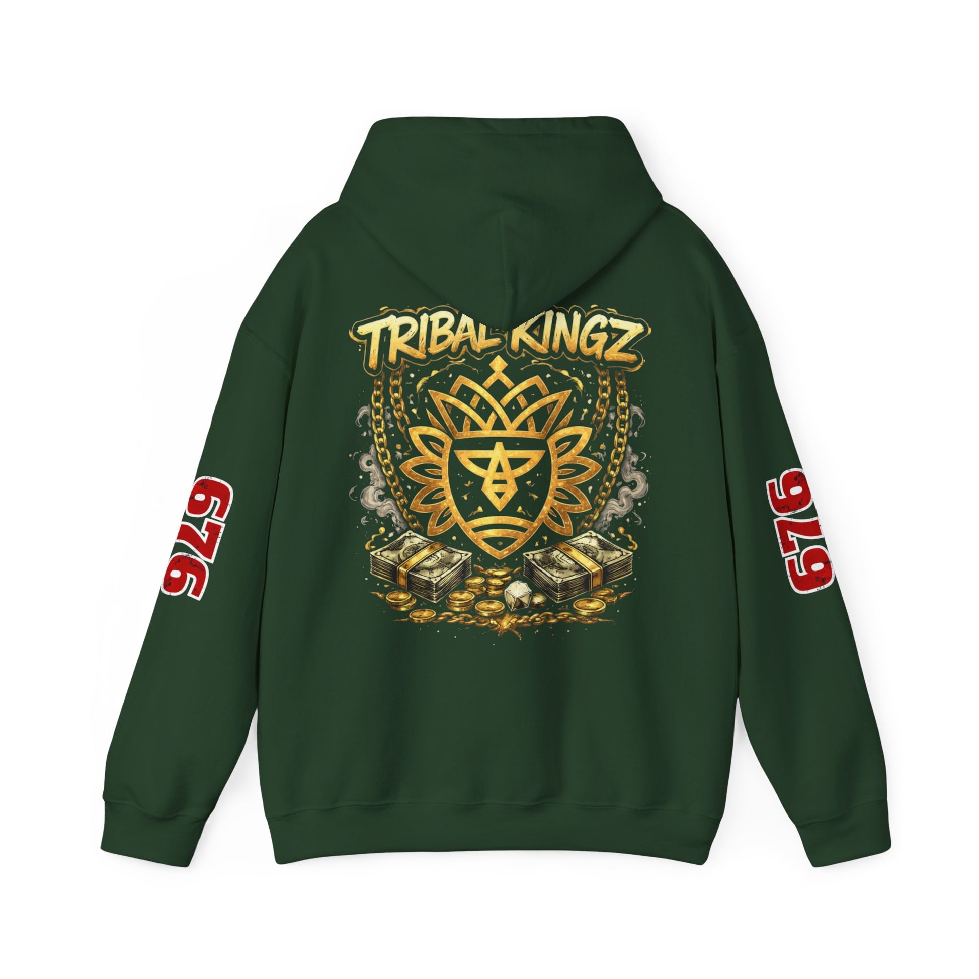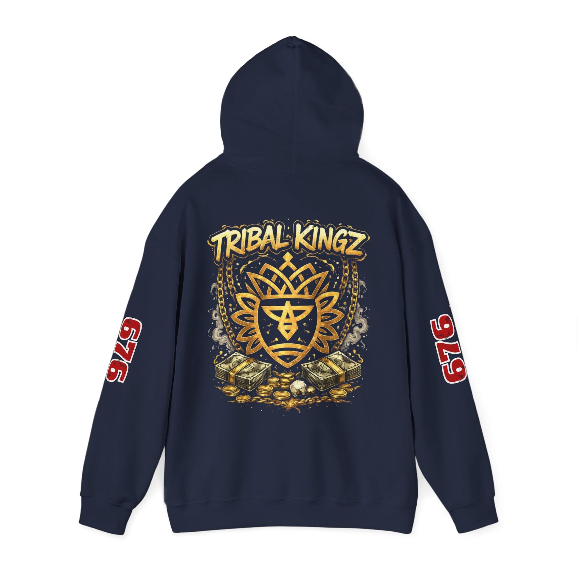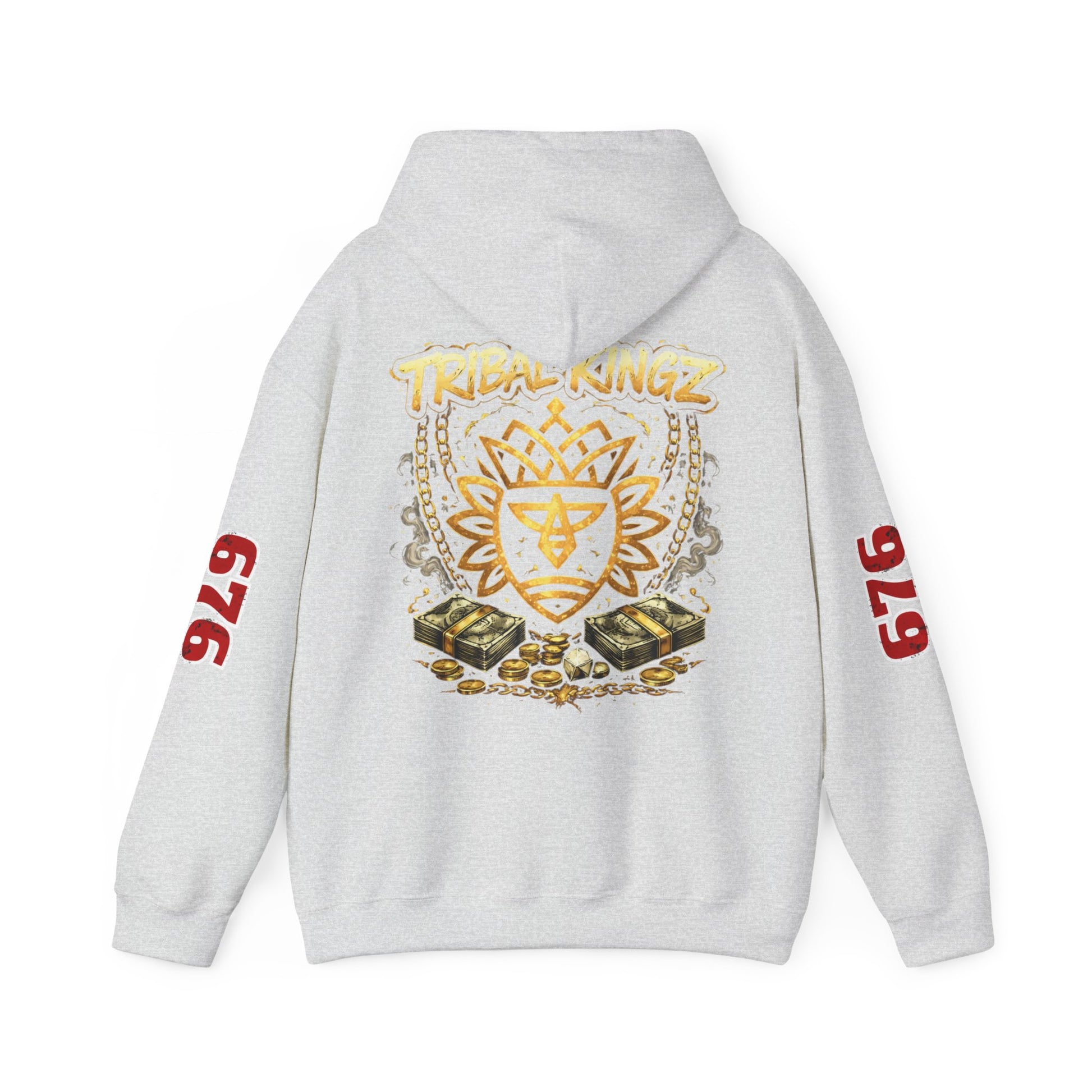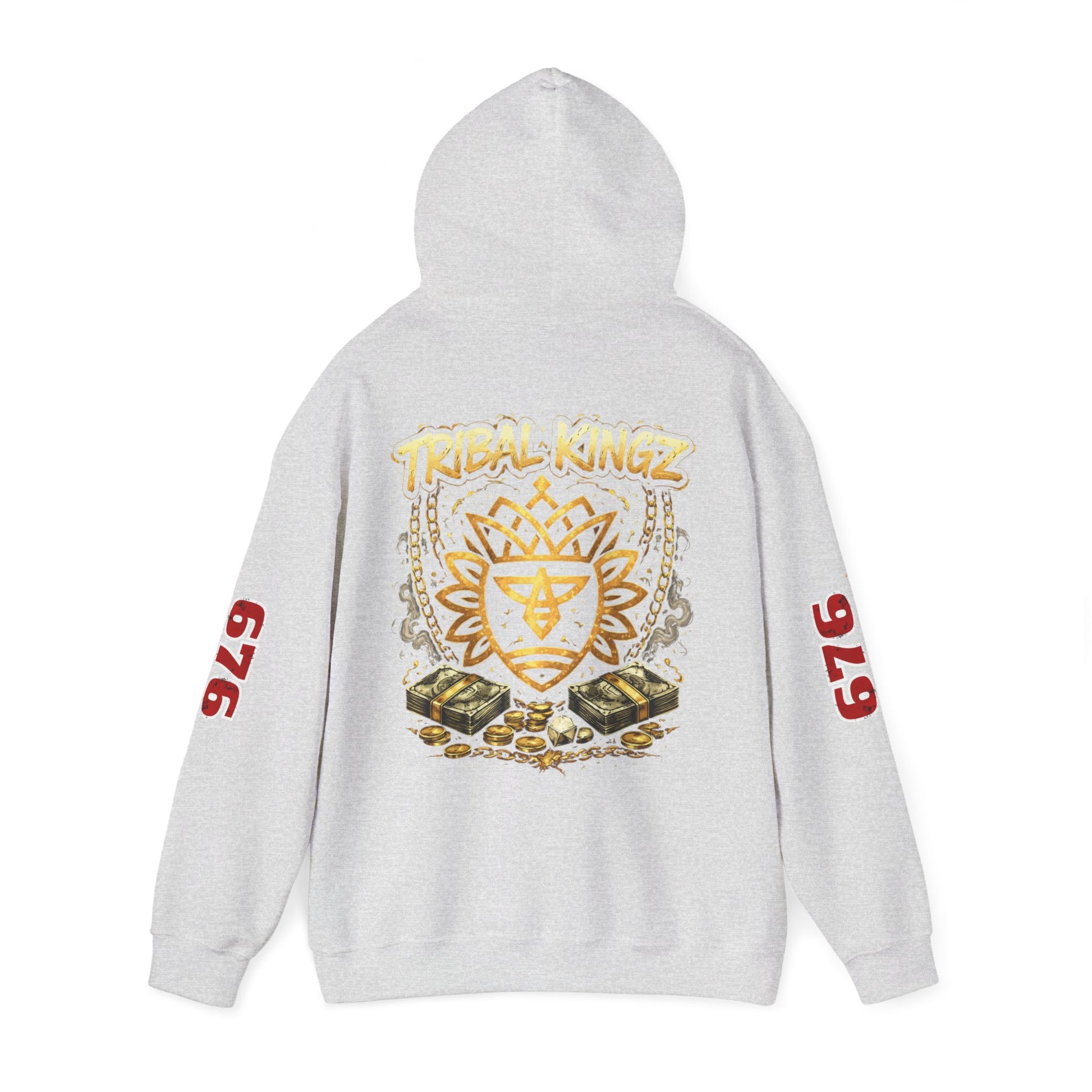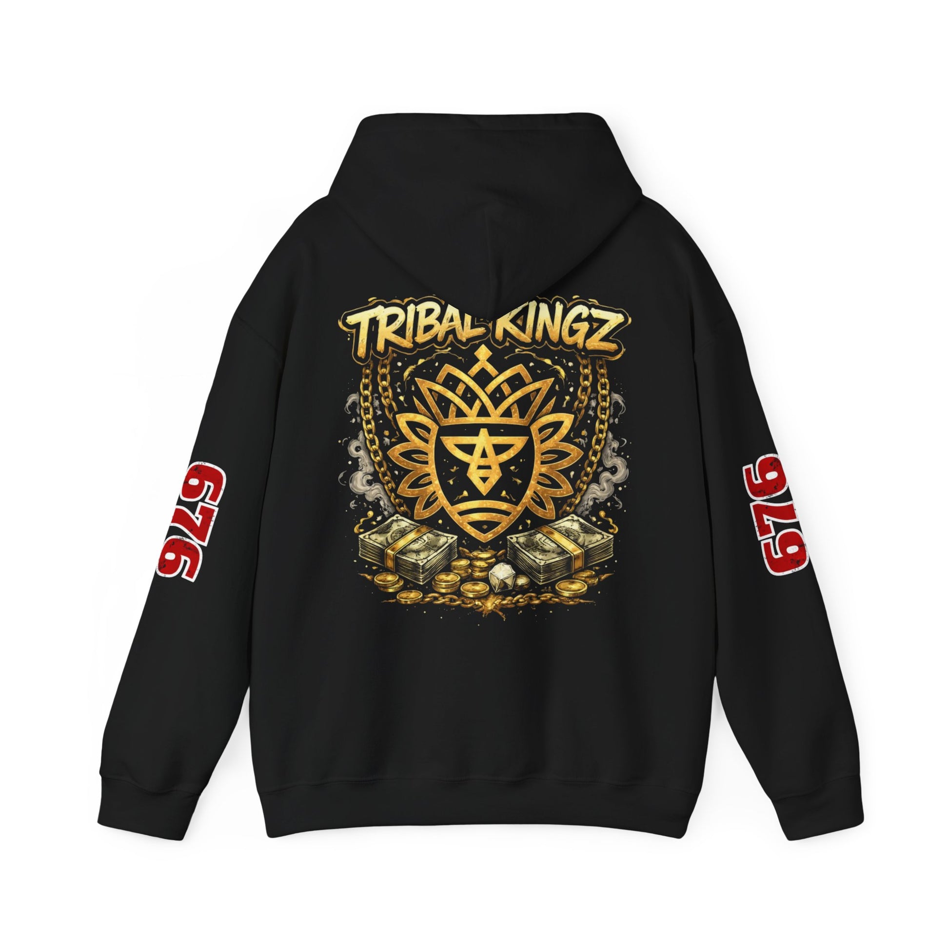 This cozy hooded sweatshirt carries a streetwise, vintage crew-club vibe — soft, warm, and built to be lived in. The front shows a compact crest motif that reads like an emblem from an underground label; the back blooms into a layered graphic with stacked iconography and a hand-lettered ‘Tribal Kingz’ script. Bold numeric prints run down the sleeves for a varsity edge. Wear it on cool nights walking the city, at late studio sessions, or layered over a tee for market runs. The fit is relaxed enough to move in, but structured by a double-lined hood and clean cuffs. It feels familiar the moment you put it on and reads like a trusted piece in a well-curated streetwear rotation.